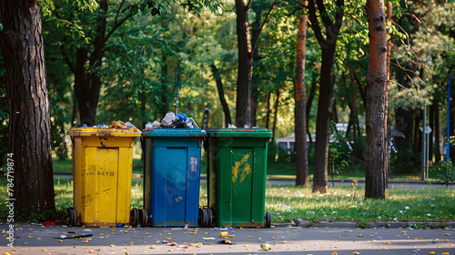 Recycling containers for sorting different types of garbage situated in a green city park