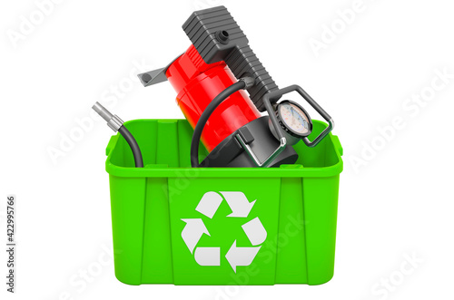reusing, bin, air compressor, automobile, pump, concept, three-dimensional, illustration, green, equipment, electrical, device, symbol, arrow, recycling, appliance, ashbin, can, container, background, white, isolated, basket, rubbish, trash, waste, signs, recyclable, ecological, reusing, business, environmental, technology, garbage, protect, pollution, savings