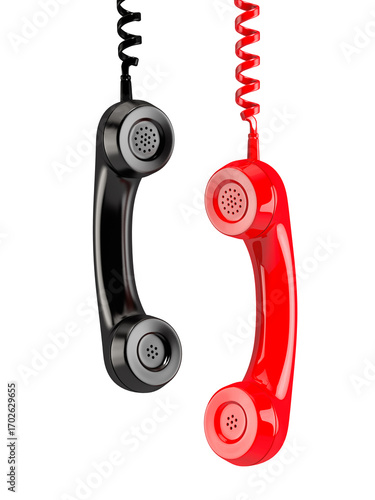 Red and black telephone receivers on a white background. Close-up. 3D rendering. Illustration.