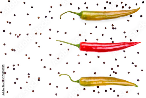 Red and green chilli peppers & black peppercorns, hot cooking spices, Isolated against a white background.