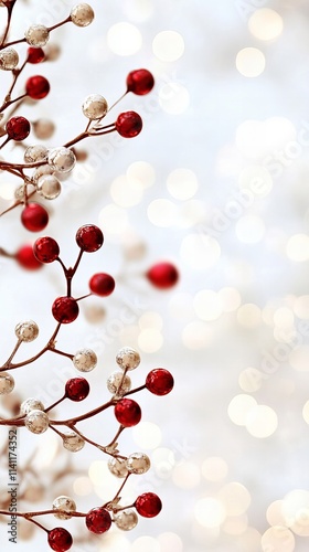 Red and white berries on a branch against a soft, bokeh background. Festive winter decoration, perfect for holiday cards or seasonal designs.