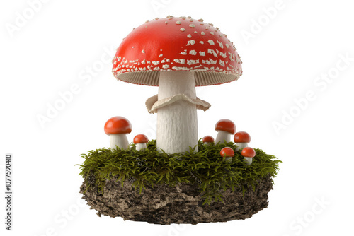 mushroom, red, white, moss, green, fungal, isolated, nature, forest, flora, ecology, gill, surrounded, smaller, mushroom, black, background, spot, style, colours, pattern, visual, creative