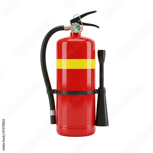 extinguisher, red, yellow, black, hose, nozzle, safety equipment, prevention, protection, industrial, commercial, apparatus, cylinder, equipment, tool, object, isolated, studio shot, clean, modern, graphic, design element, emergency