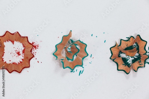 Red, blue and green colored pencil shavings on white background