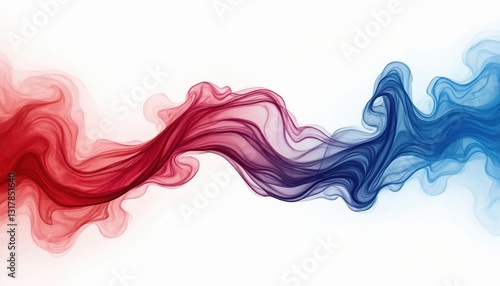 Red, blue smoke swirls on white backdrop. Abstract wispy tendrils float, dance dynamically. Vibrant contrasting colors create modern design element. Delicate graphic art illustration, creative