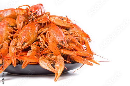 Red boiled crayfish on white large dish on white background