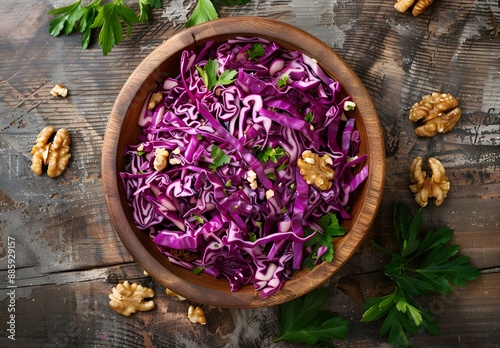 Red Cabbage Walnut Salad in Wooden Bowl