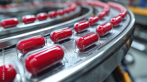 Red capsules moving along a conveyor belt in a pharmaceutical manufacturing facility during daytime operations