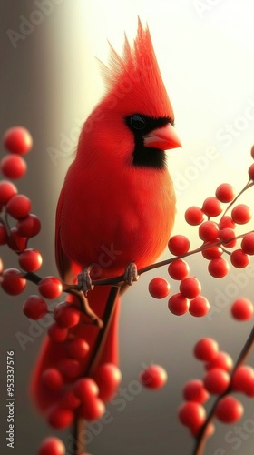 Red Cardinal Bird Perched on a Branch with Red Berries