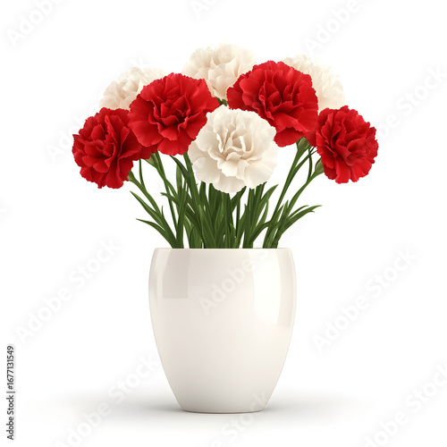 Red carnation and white carnation in ceramic pot, bouquet flower arrangement green stem home decor freshness Red and white carnation