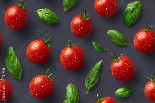 Red cherry tomato pattern with green basil leaf. Fresh garden vegetable design for cooking, food, and healthy eating concept.