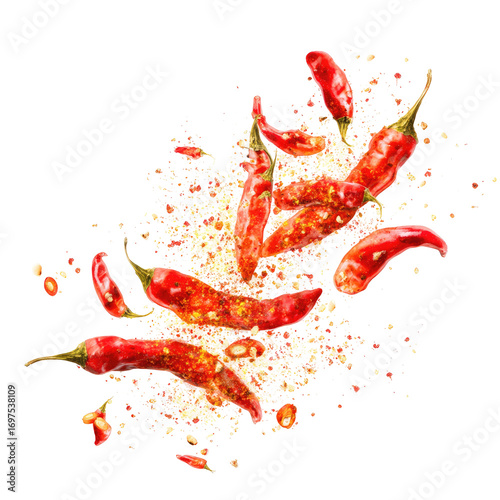 chili, pepper, red, spice, explosion, flying, hot, vibrant, colourful, food, fresh, organic, cookery, ingredient, favor, alimentary, healthy, spicey, heat, detail, closeup, texture, freshness, sharp, intense, bold, fiery, blood-red, scattered, sprinkled, powder, grain, blend, mixed, nutrient, energy, natural, delicious, background, isolated, abstract, food photography