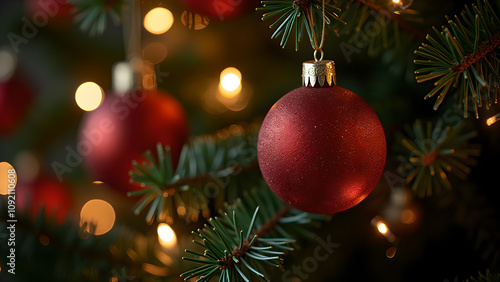 christmas, tree, ornament, red, bauble, decoration, festive, holiday, winter, light, celebration, season, christmas, december, new year, sparkle, glistering, joy, happiness, family, tradition, gift, present, background, bokeh, blur, warm, cosy, magical, evergreen, fir, pine, needle, ball, shiny, glossy, elegant, beautiful, christmas tree, christmas lights, christmas decoration