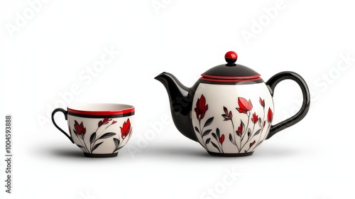 Red Floral Teapot and Cup: A charming black and white teapot with a delicate floral pattern in red, paired with a matching cup. Perfect for adding a touch of elegance to your afternoon tea.