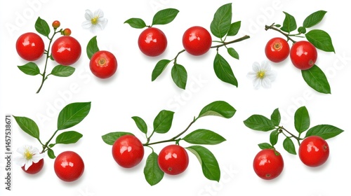 fruit, red, green, tree branch, ripe, berry, plant, leaf, flower, blossom, white, nature, fresh, glossy, vibrant, isolated, white background, studio shot, overhead, topview, detail, pattern, natural, healthy, food, ingredient, organic, botany, design, commercial, wallpaper, template, decoration, graphic, illustration, cook, grow, harvest, colours, texture, closeup, shine, bright, simple, minimal, copy space