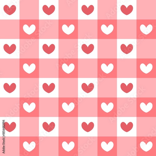 Red gingham checkered pattern with cute hearts. Red and white plaid background for Valentine's Day, romantic gift wrap, wallpapers, and textile design. Trendy aesthetic illustration.