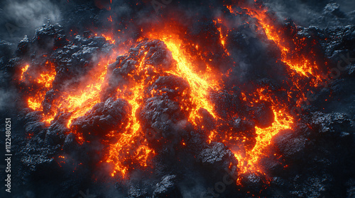 Red glowing lava flows from a volcano. View of the crater from above. Steam and smoke near the crater. cooled magma around craters. clouds in the sky at day