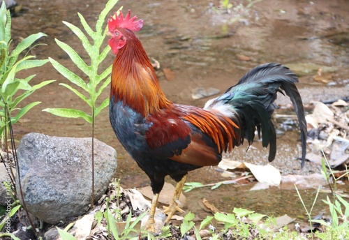 Red Junglefowl (Gallus gallus) in the Water Gardens of Vaipahi, Tahiti, Society Islands, French Polynesia.