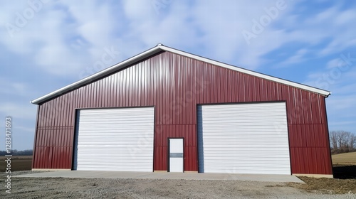 Red Metal Garage with Double Doors: A classic red metal garage with double garage doors and a single door on the side is nestled against a bright blue sky with wispy clouds.