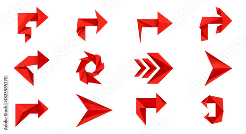 Red origami arrows set direction pointers navigation elements geometric shapes design graphic illustration 3d