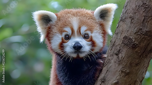 red panda, panda, baby animal, tree, wildlife, zoo, animal, nature, cute, fluffy, mammal, forest, fur, eye, adorable, wild, baby, red, brown, white, climbing, branch, leaf, green, background, jungle, portrait, closeup, fauna, outdoors, summer, spring, ecology, conservation, endangered, asia, exotic, wilderness, creature, photo, image, picture, stock