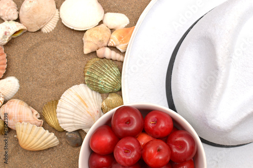 Red plums, shells and white hat on sand