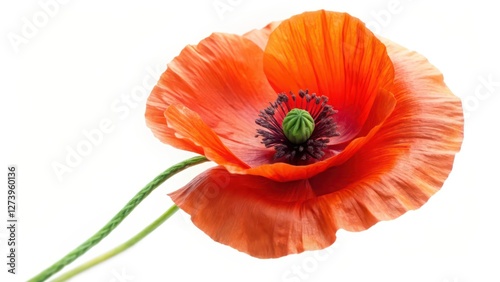 flower, poppy, red, bloom, blossom, flower petals, stem, plant, botany, flora, nature, single, isolated, white, background, studio, photo, macro, detail, vibrant, colours, orange, texture, delicate, fragile, summer, spring, botanical, image, illustration, graphic, design, element, object, cut-out, closeup, sharp, sharpened, bright, contrast, composition, visual