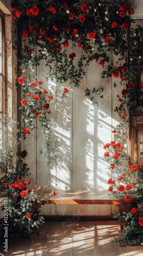 red, rose, flower, vine, leaf, wall, wood, wooden, window, light, shadow, sunlight, floral, plant, climbing, interior, nature, bloom, flower petals, rustic, antique, bench, decor, space, empty, texture, garden, delicate, stem, branch, beautiful, elegant, vibrant, romantic, classic, style, natural, organic, detail, arrangement, display, bungalow, artistic, vertical, perspective, pattern, frame