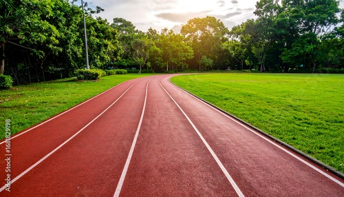 Red running track through a park