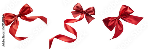 Red Satin Ribbons with Bows and Curled Twists Isolated Transparent Background PNG