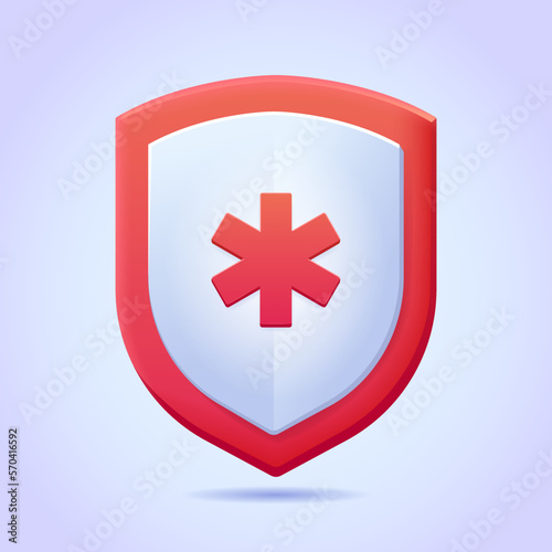 Red shield with star of life mark. Medicine, emergency, ambulance, hospital, healthcare concept. 3d vector icon for web site, banner, landing page, print. Shield three dimensional illustration.
