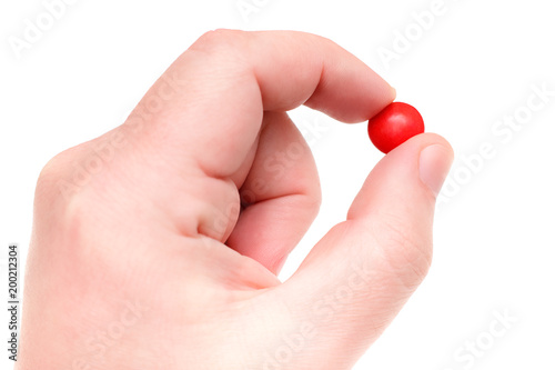 accent, show, sharpened, male, skin, favor, ingredient, vitamin, bright, 1, small, sweet, food, care, caucasian, background, white, isolated, closeup, hold, take, finger, hand, red, colours