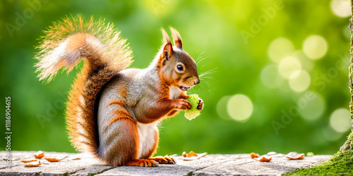 squirrel, rodent, mammal, wildlife, wild animal, nature, animal, cute, fluffy, eating, food, green background, bokeh, outdoors, forest, timberland, park, garden, spring, summer, autumn, closeup, detail, furry, adorable, charming, beautiful, pretty, macro, sharpened, sharp, vibrant, colours, sunlight, mossy, stone, leaf, fall, tree branch, tree, environment, conservation