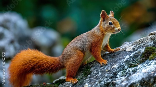 squirrel, animal, wildlife, nature, rock, forest, mammal, brown, red, closeup, detail, texture, fur, tail, cute, rocky, natural light, daytime, vertebrate, photo, image, closeup, fauna, nature scene, wild animal, forest floor, animal portrait