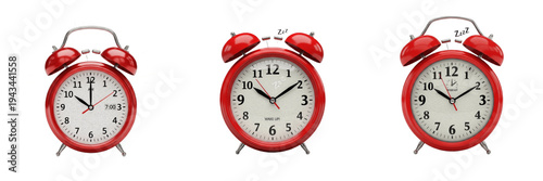 alarmclock, clock, red, set, collection, vintage, analog, bell, morning, wake up, time, deadline, schedule, management, bedside, table, desk, office, home, decor, metal, ringing, alert, reminder, hours, minute, second, classic, traditional, realistic, three-dimensional, icon, element, object, isolated, white background, transparent, cut-out, high-quality