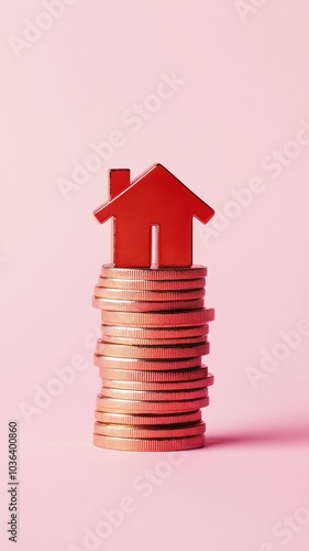 Red Upward arrow on money coin stack as growth graph steps in home shape symbol,Savings, income, home investment, real estate price value, property profit concepts,the rising price of real estate.