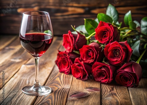 red wine, rose, romantic, dinner, february 14, still life, food photography, wine glass, flower, red, love, elegant, beautiful, delicious, drink, beverage, celebration, date, couple, passion, sensual, luxury, epicure, table, wooden, background, texture, closeup, macro, photo, image, picture, photo, stock, hi-res, royalty free, download, wine bottle, flower petals, stem, leaf, bouquet, arrangement, table setting, candlelight, dark, light, shadow, rustic