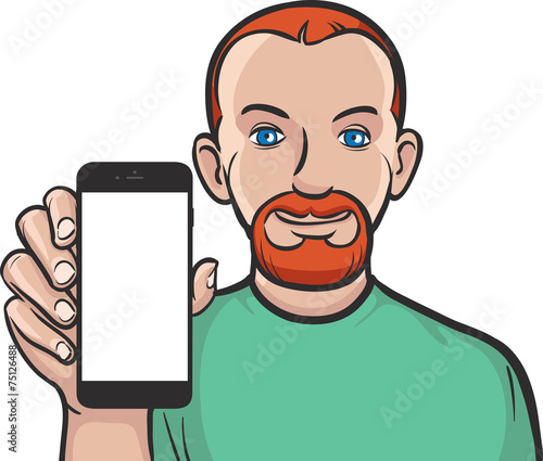 vector, illustration, cartoon, character, person, business, hand, people, retro, shopping, technology, mobile, app, phone, smartphone, phone, mobile phone, display, touch screen, touch screen, mobile phone, text message, screen, wireless, message, messaging, texting, application, interface, cyberspace, white background, isolated, holding, showing, face, head, eye, man, happy, smile, irish, beard, red, ireland
