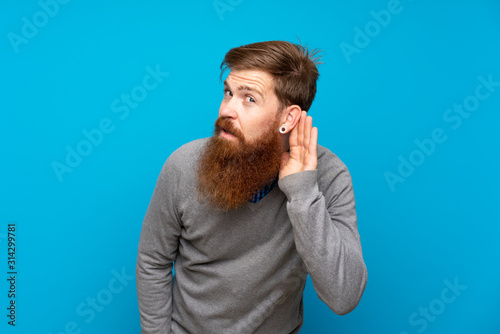 Redhead man with long beard over isolated blue background listening to something by putting hand on the ear