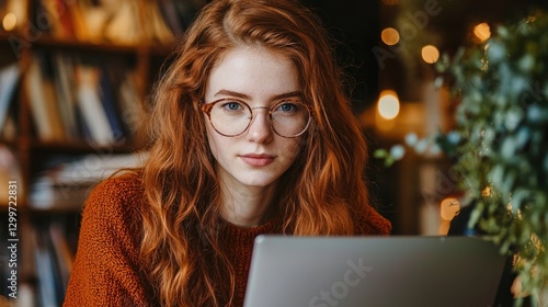 woman, girl, redhead, red hair, goggles, laptop, computer, library, book, bookshelf, studying, learning, reading, working, technology, cyberspace, education, student, young, pretty, beautiful, portrait, indoor, cafes, cafes, cosy, warm, sharpened, serious, confident, intelligent, professional, office, desk, table, fashion, style, hair, model, people, person, female, lifestyle, digital, screen, attractive, expression