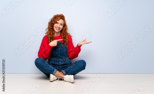 Redhead woman with overalls sitting on the floor holding copyspace imaginary on the palm to insert an ad