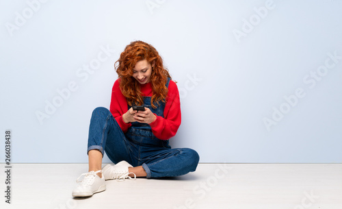 Redhead woman with overalls sitting on the floor sending a message with the mobile