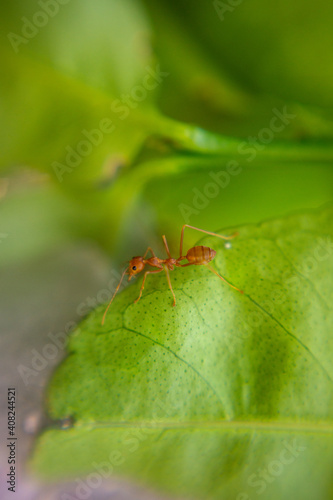 Red-orange ant on a green leaf.