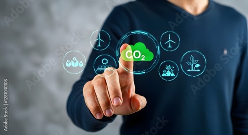 Reduce CO2 emission concept. Person pointing at transparent environmental icon, including CO2 reduction, sustainable practices, and eco-friendly initiatives. carbon neutrality, solar energy, recycling