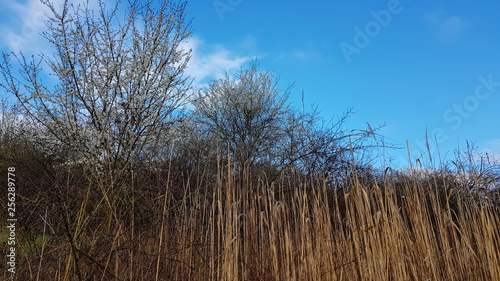 Reeds in the lake.Grass and blue sky.Morning in the forest