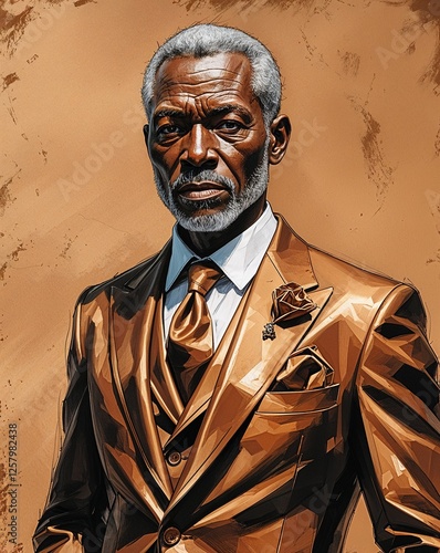 Refined bronze suit with matching pocket square plain bronze background Elderly black African man background illustration portrait 3D