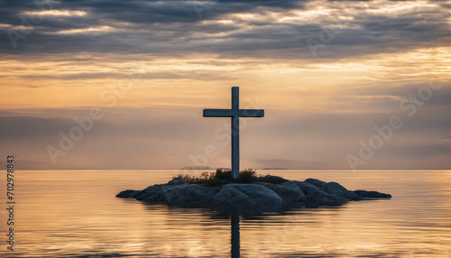Reflecting on the tranquil waterside with the holy cross brings a sense of peace and stability for meditation, while the expansive sky provides a serene backdrop for creativity.