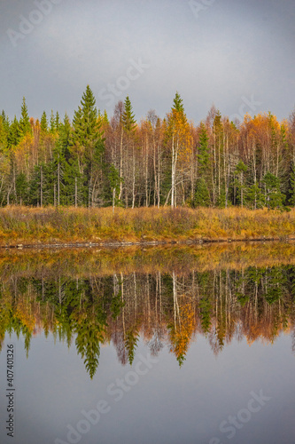 Reflection from fir trees in a lake