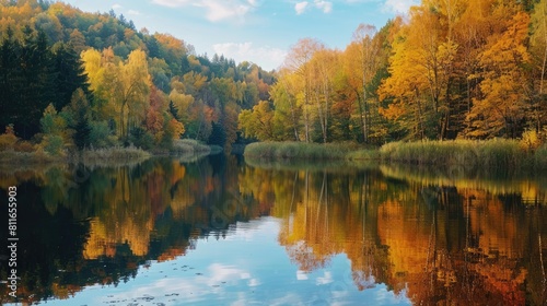 Reflection of serene water showcases a forest by the river in autumn