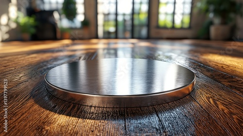metal, disc, wooden, surface, table, round, reflective, polished, chrome, steel, rustic, texture, background, design, modern, minimalist, interior, display, product, showcase, photo, still life, studio, lighting, shine, glossy, bright, clean, smooth, contemporary, elegant, industrial, setting, object, decor, image, visual, graphic, composition, dark, brown, sunlight